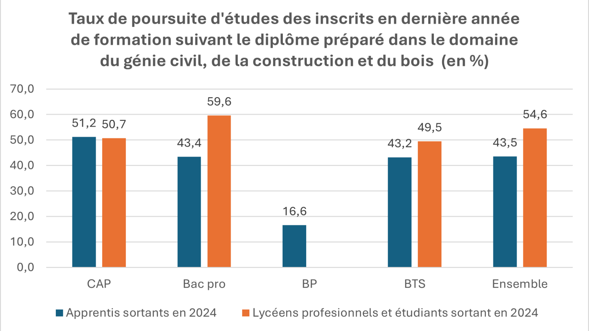 Il est important de noter que le taux de poursuite d’études des apprentis et des lycéens professionnels dans le domaine du génie civil, de la construction et du bois est supérieur de 4,3 points à celui des apprentis toutes spécialités confondues. Cela est également vrai, mais dans une moindre mesure, pour les lycéens professionnels avec une poursuite d’étude supérieure de 0,5 points par rapport à l’ensemble des spécialités.